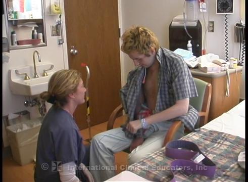 The therapist demonstrates ADL training and upper extremity dressing techniques with a young stroke survivor exhibiting expressive aphasia, cognitive/perceptual deficits and right hemiplegia in the acute care hospital.